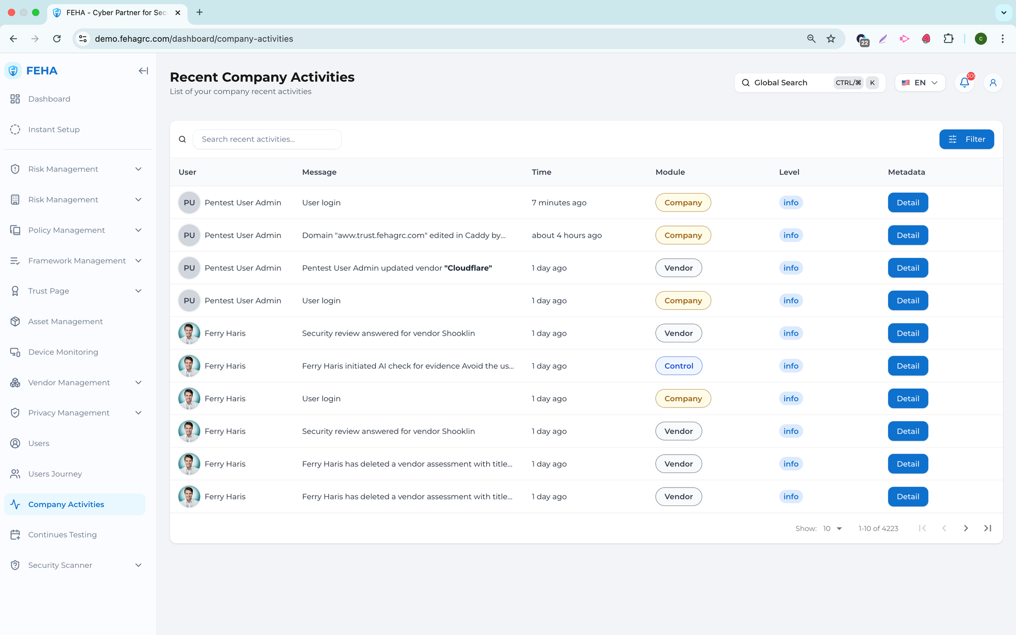 The Company Activities menu offers a centralized overview of system and user actions within the organization. It enables monitoring, traceability, and review of activities across the platform.