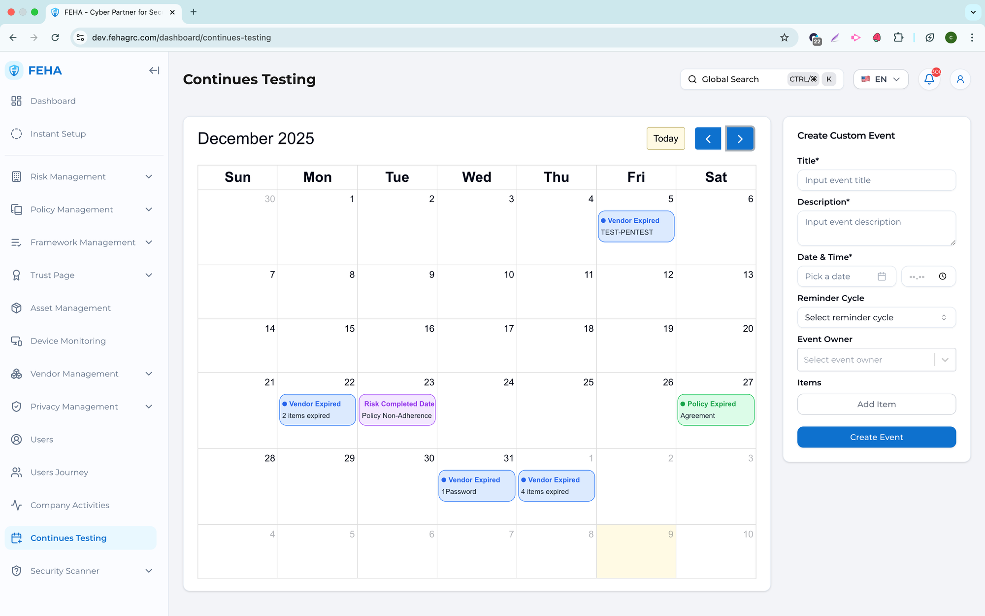 The Continues Testing menu manages scheduled testing activities and custom events, offering a calendar view of planned and ongoing activities.