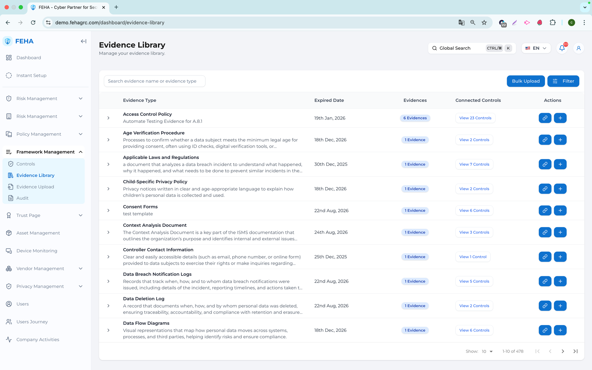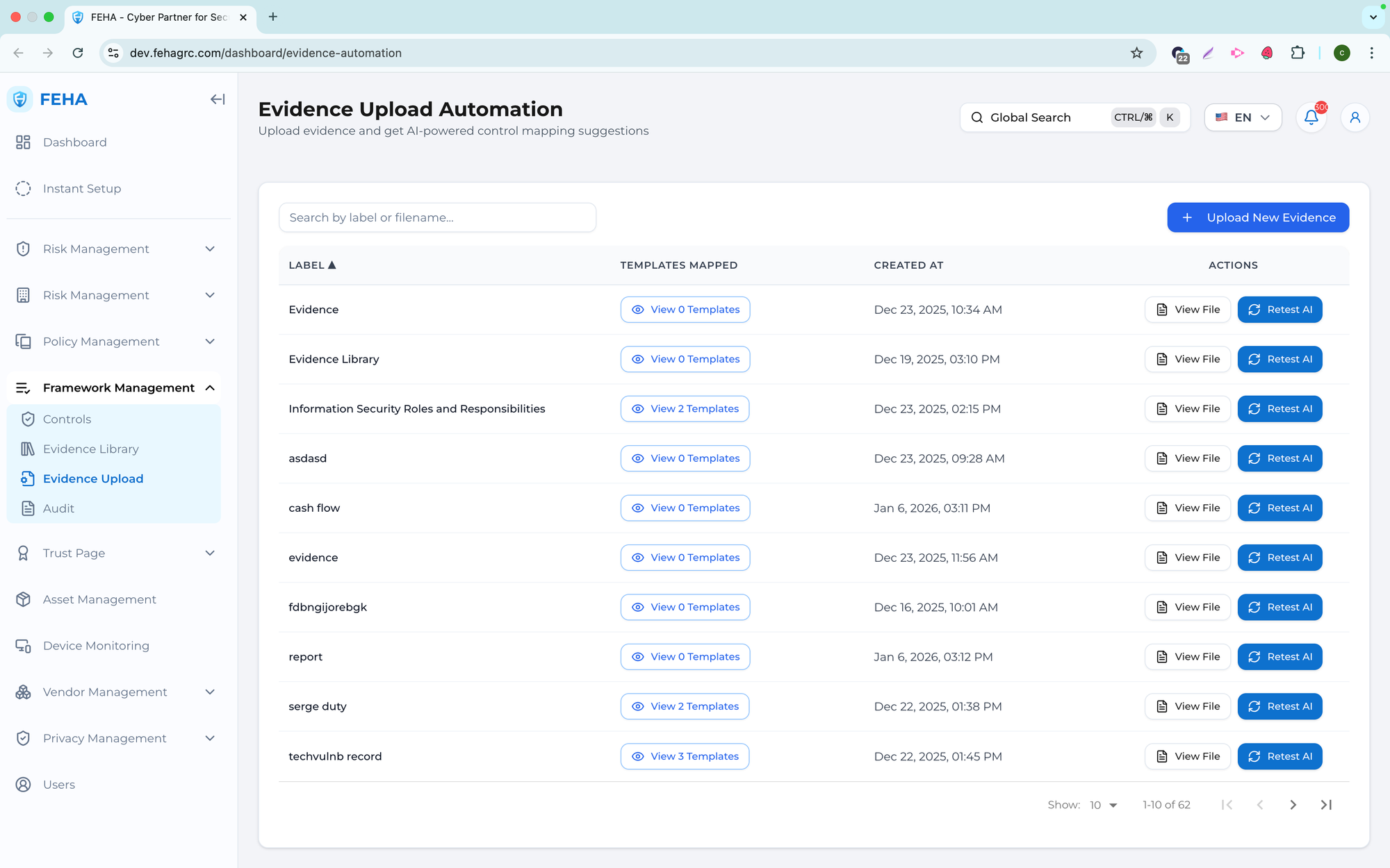 The Evidence Library submenu serves as a centralized repository for managing evidence across frameworks and controls. It enables searching, filtering, uploading, linking, reviewing, and analyzing evidence to support traceability and audit readiness.