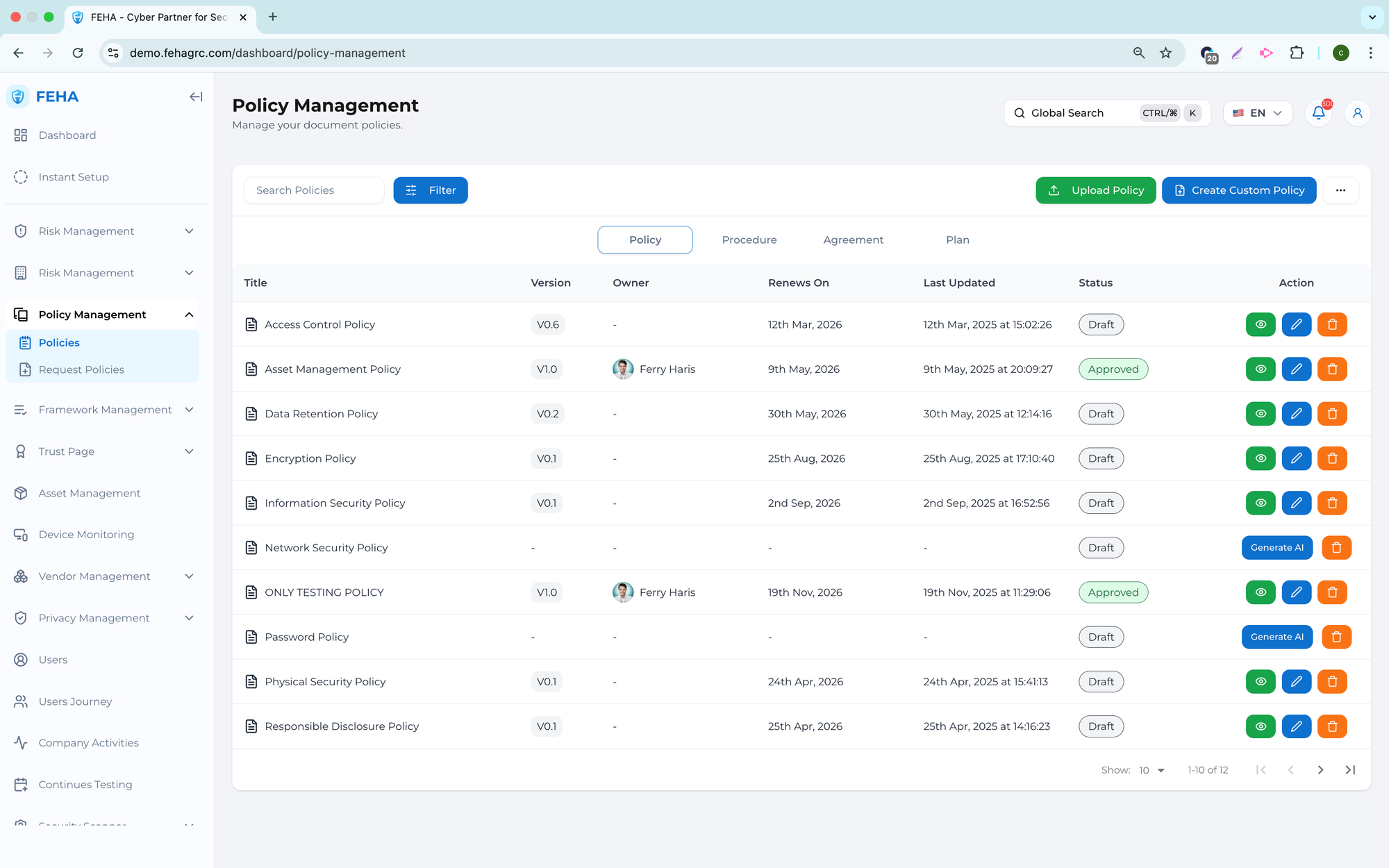 The Policy Management module supports structured internal governance by ensuring that policies are consistently documented, approved, distributed, and acknowledged.