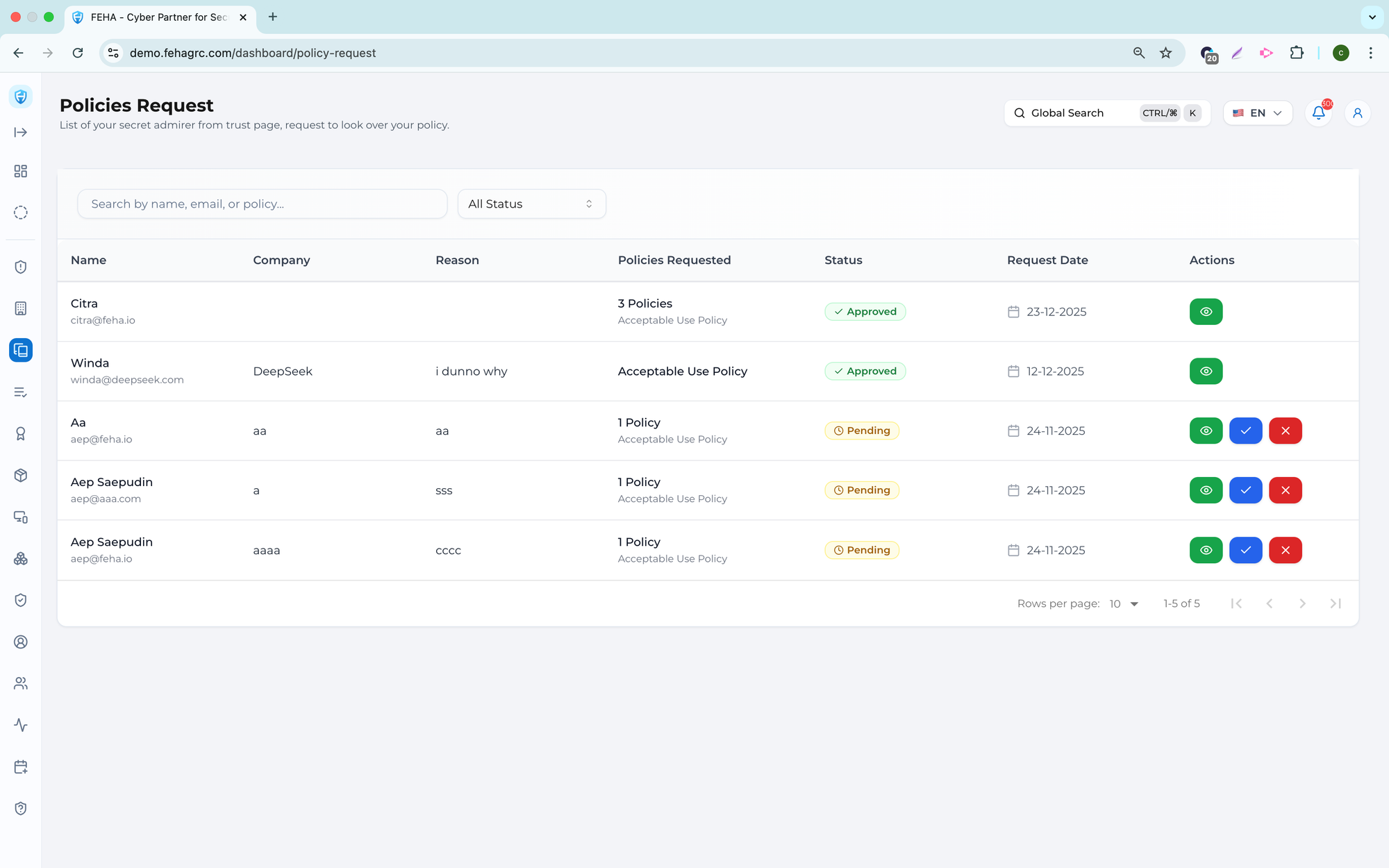 The Request Policies feature manages external policy access requests submitted through the Trust Page. It promotes transparency while ensuring controlled disclosure. All requests undergo internal review before access is granted.