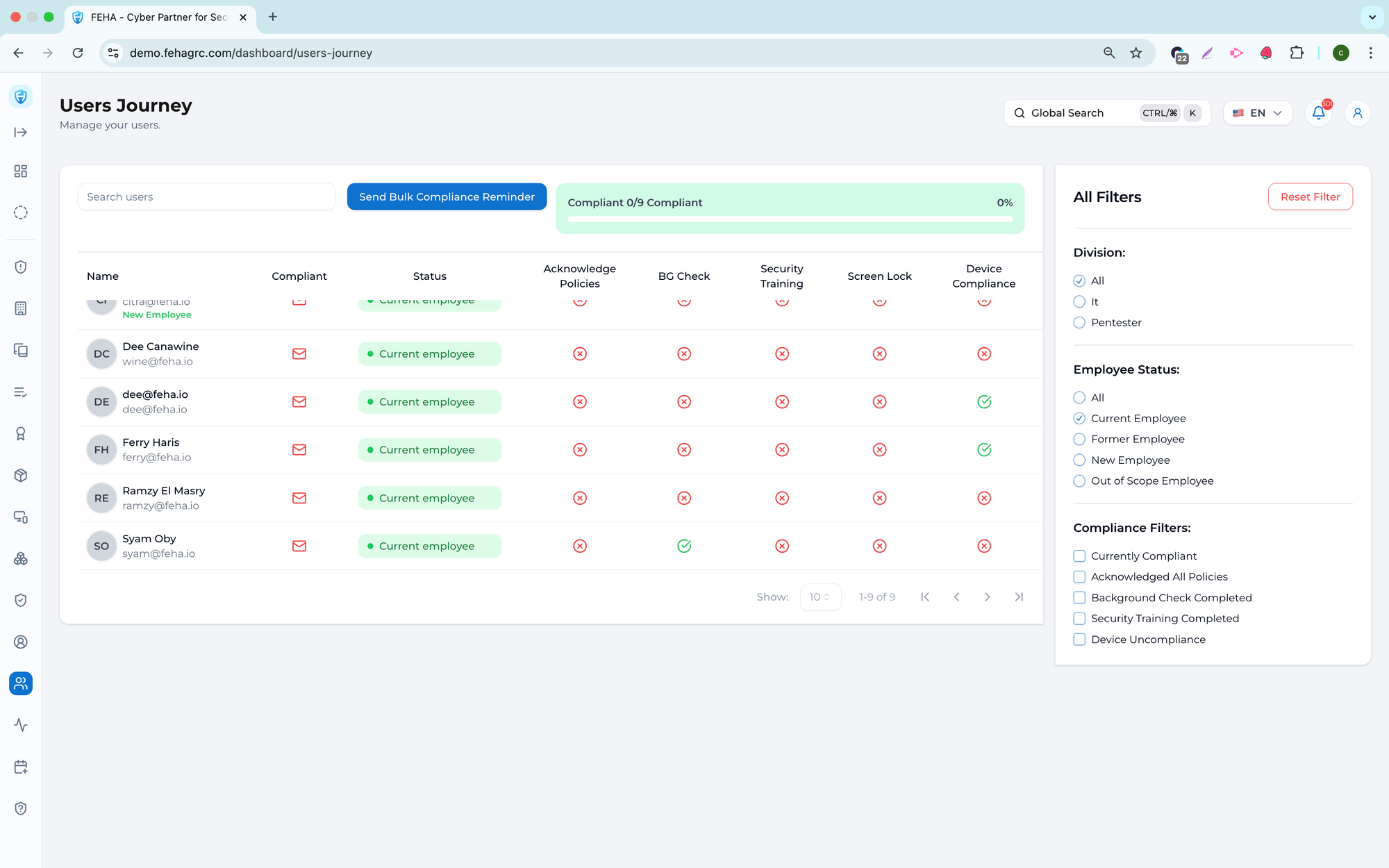 The Users Journey menu offers insight into user compliance activities and personnel documentation. It enables compliance monitoring, document management, and user status tracking throughout the user lifecycle.